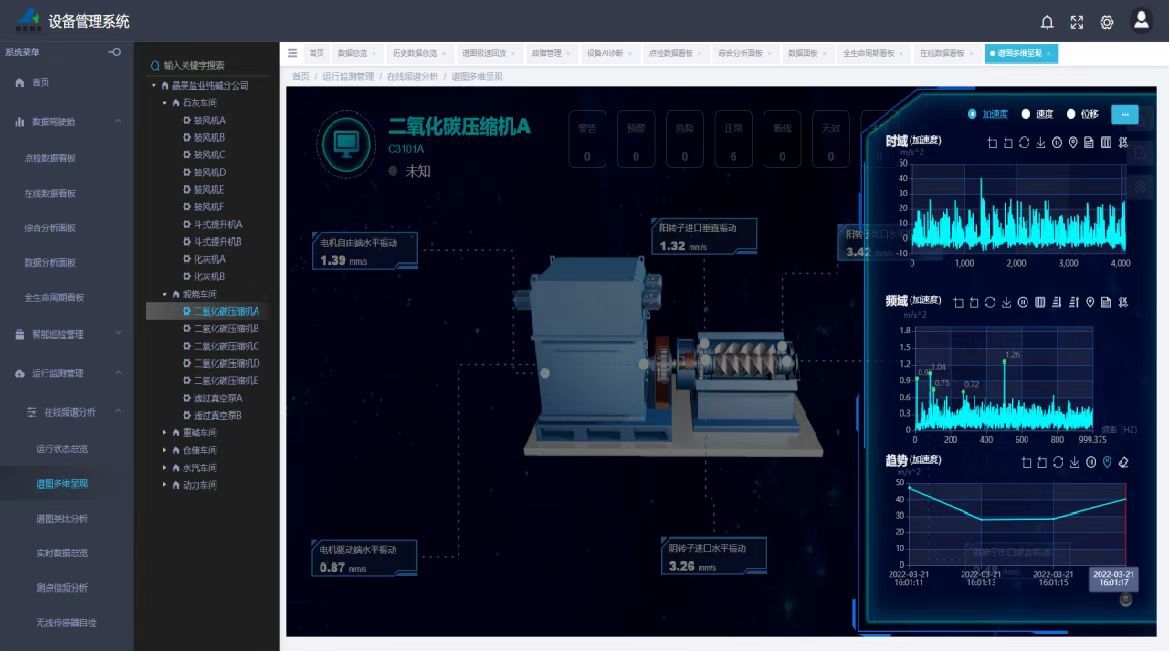 晶昊盐化的核心设备包括:二氧化碳压缩机、精盐水泵、鼓风机、引风机等,状态监测系统在设备故障报警之后可准确定位到故障零部件并精准判断故障类型,主要优势如下: