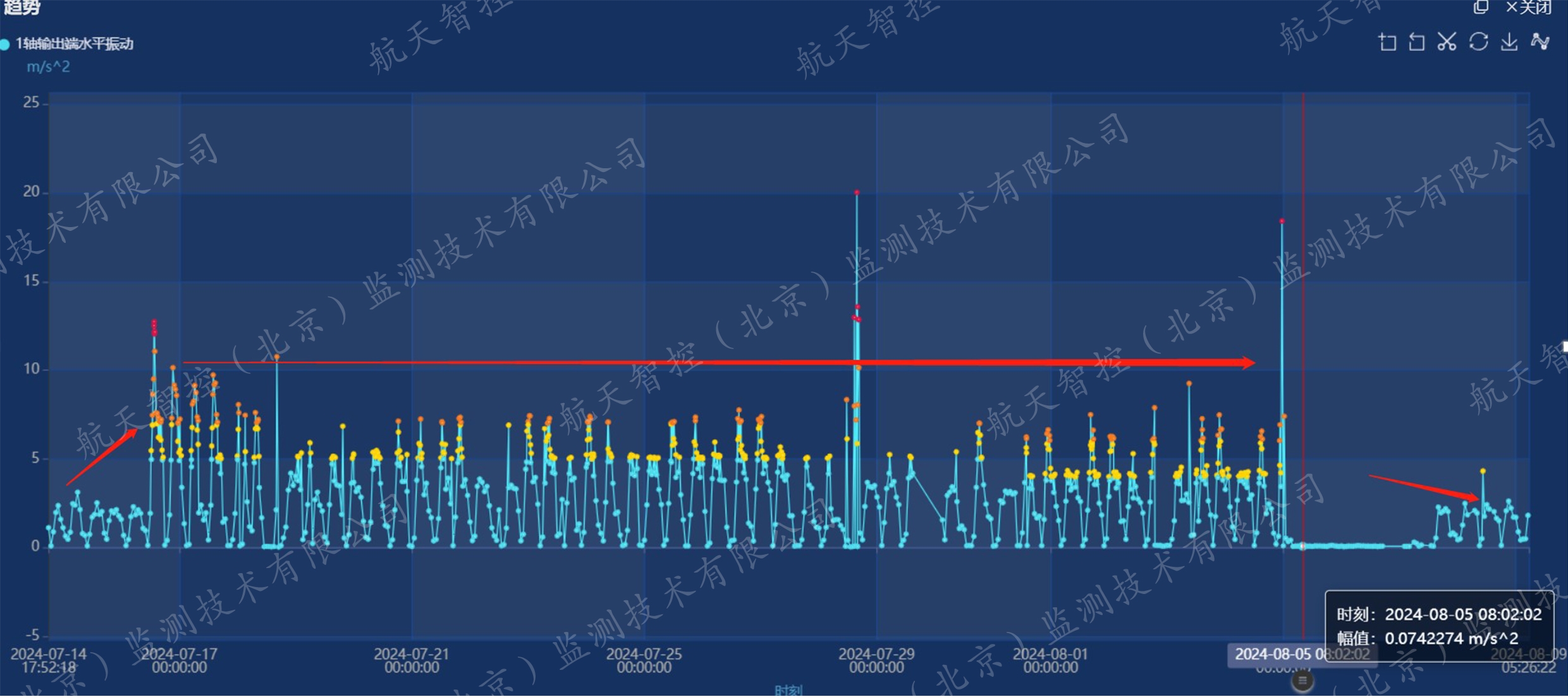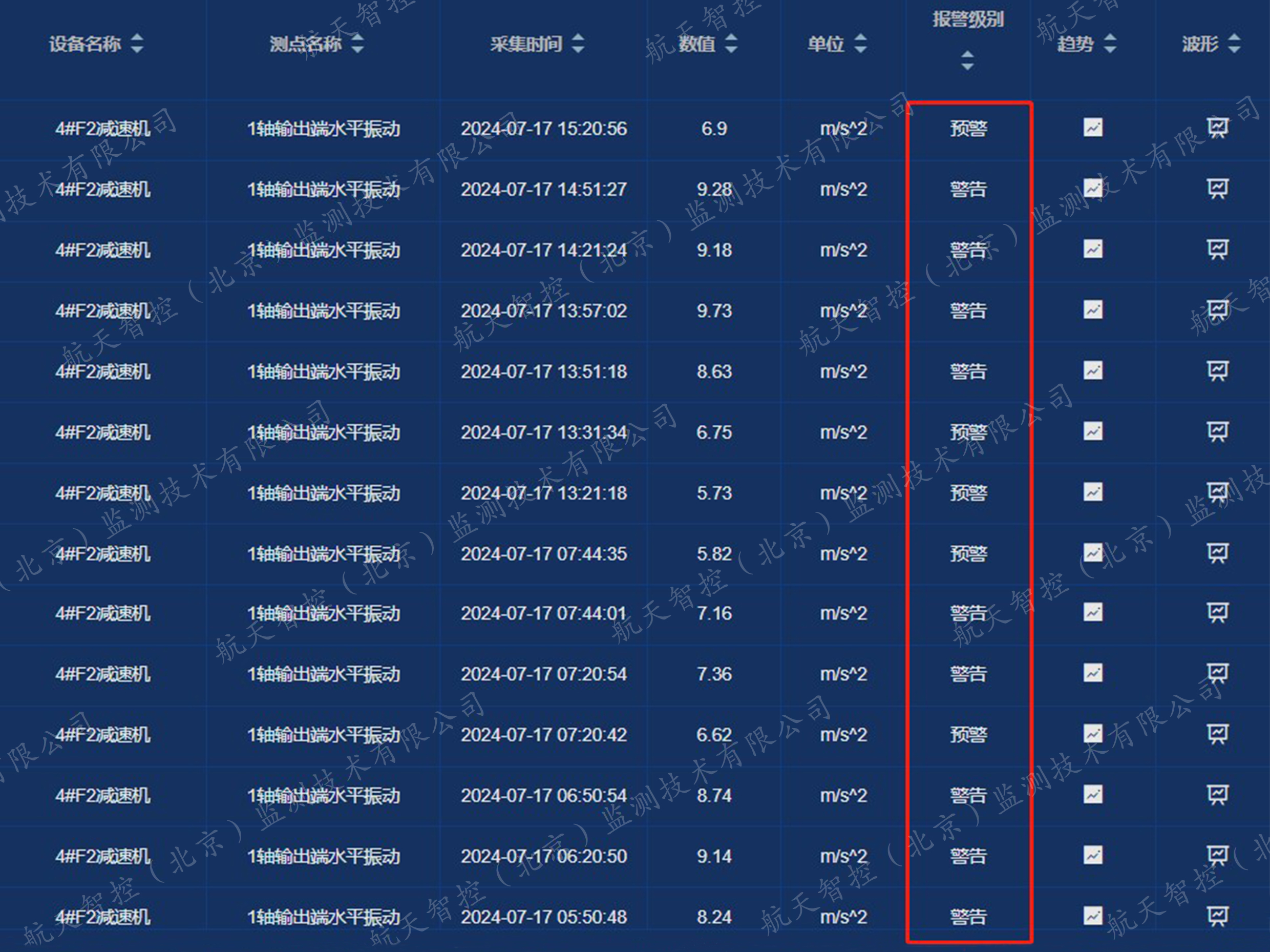 7月16日下午约13:00,精轧减速机出现异常波动,航天智控的智能运维系统凭借敏锐的“触觉”,第一时间捕捉到了这一细微变化。系统监测显示,精轧减速机各轴振动值开始出现上升,尤其是其一轴及二轴输出端较为明显,振动值最高上升至12m/s2左右,达到警告级别,瞬间触发智能报警。